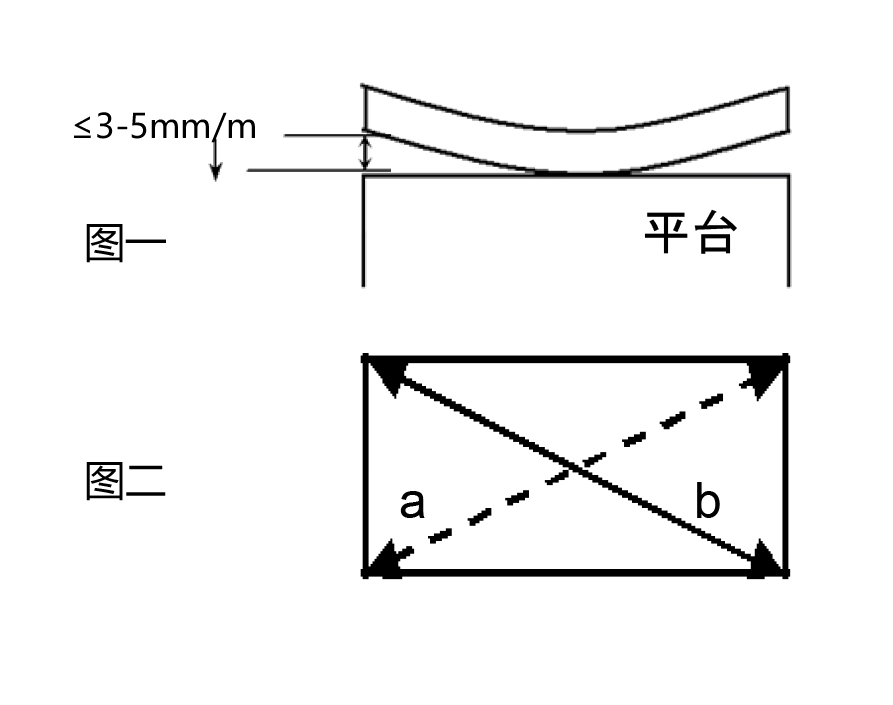 • 板面平整度:将钢板置于检测平台上,钢板与平台之间空隙距离≤3-5mm/m(如图一)
